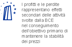 Alla BCE è stata attribuita una quota pari all’8% del valore totale dei biglietti in euro in circolazione. Tale quota trova contropartita nei crediti verso le BCN, che producono interessi al tasso applicato dall’Eurosistema nelle aste delle operazioni di rifinanziamento principali e sono esposti alla voce “Crediti derivanti dall’allocazione delle banconote in euro all’interno dell’Eurosistema” dello stato patrimoniale. Gli interessi confluiscono nella voce “Interessi attivi derivanti dall’allocazione delle banconote in euro all’interno dell’Eurosistema” del conto economico. I costi derivanti dal trasporto transfrontaliero delle banconote in euro fra le officine carte valori e le BCN, per la consegna dei biglietti nuovi, e fra le BCN, per la gestione delle scorte, sono sopportati a livello centrale dalla BCE. Tali costi sono esposti nel conto economico alla voce “Servizi di produzione delle banconote”. | Il portafoglio detenuto a fronte dei fondi propri della BCE è rilevato principalmente alla voce “Altre attività finanziarie” dello stato patrimoniale. Gli interessi cedolari e i premi e gli sconti ammortizzati sono iscritti nel conto economico alle voci “Altri interessi attivi” e “Altri interessi passivi”. Le perdite da prezzo non realizzate, per la parte eccedente gli utili da prezzo precedentemente registrati sugli stessi strumenti, nonché gli utili e le perdite realizzati derivanti dalla vendita di titoli sono anch’essi imputati al conto economico, rispettivamente alle voci “Svalutazioni di attività e di posizioni finanziarie” e “Utili e perdite realizzati rivenienti da operazioni finanziarie”. Gli utili da prezzo non realizzati sono iscritti alla voce “Conti di rivalutazione” dello stato patrimoniale. |