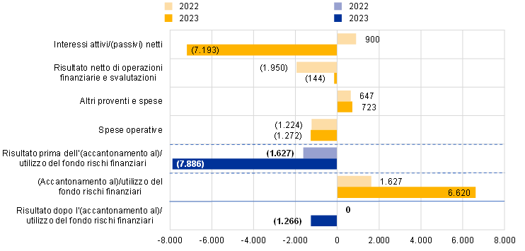 La perdita della BCE per il 2023, in seguito all’utilizzo dell’intero ammontare del fondo rischi finanziari, è pari a 1.266 milioni di euro (zero nel 2022). Per decisione del Consiglio direttivo, tale perdita sarà portata a nuovo nello stato patrimoniale della BCE e coperta con gli utili degli esercizi successivi.