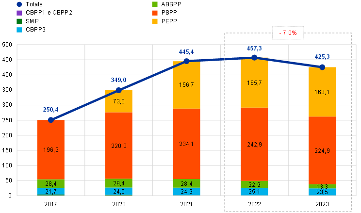 Sulla base delle relative decisioni del Consiglio direttivo, l’Eurosistema ha continuato a reinvestire interamente il capitale rimborsato sui titoli in scadenza nell’ambito del PEPP nel corso dell’anno e nell’ambito del PAA sino alla fine di febbraio 2023. Dall’inizio di marzo alla fine di giugno 2023, l’Eurosistema ha effettuato solo reinvestimenti parziali nell’ambito del PAA, che sono quindi terminati a luglio 2023. A seguito di tali decisioni, il portafoglio dei titoli detenuti dalla BCE per finalità di politica monetaria è diminuito di 31,9 miliardi di euro collocandosi a 425,3 miliardi (grafico 2); le consistenze del PSPP, dell’ABSPP e del CBPP3 nell’ambito del PAA hanno registrato rispettivamente una flessione di 18,0 miliardi di euro, di 9,5 miliardi e di 1,6 miliardi riconducibile ai rimborsi. Il portafoglio del PEPP si è ridotto di 2,6 miliardi di euro, principalmente per l’impatto netto dell’ammortamento dei premi e degli sconti[8] sui titoli detenuti.
