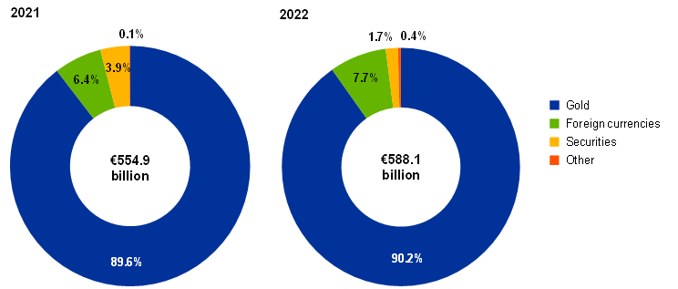 In 2022 the value of the Eurosystem’s gold and gold receivables (asset item 1) increased by €33.5 billion to €592.9 billion (Chart 4), primarily reflecting the rise in the market price of gold in euro terms. This increase also led to an equivalent increase in the Eurosystem’s gold revaluation accounts.