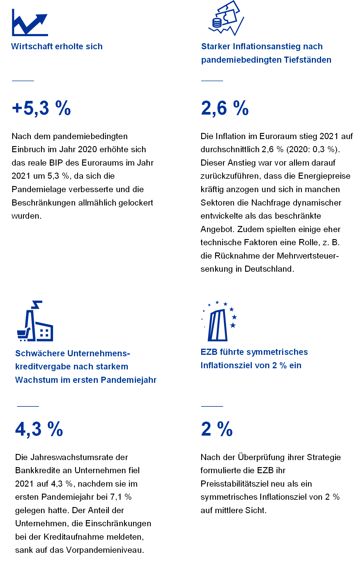 Im Jahr 2021 stabilisierte sich die wirtschaftliche Erholung im Euroraum nach der pandemischen Notlage. Die Konjunktur gewann kräftig an Fahrt, und das reale BIP stieg um 5,3 %. Das Wachstum schwächte sich am Jahresende allerdings ab, als die Omikron-Welle der Covid-19-Pandemie erneut Einschränkungen notwendig machte. Bei der Beschäftigung war der Aufschwung ebenfalls zu spüren: Die Arbeitslosenquote sank zum Jahresende auf ein Rekordtief.