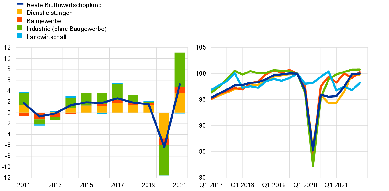 Das Produktionswachstum entwickelte sich 2021 in den einzelnen Wirtschaftssektoren weiterhin ungleichmäßig (siehe Abbildung 1.7). Sowohl die Industrie als auch das Dienstleistungsgewerbe leisteten einen positiven Beitrag, wobei die Industrie am meisten zur realen Bruttowertschöpfung beisteuerte.