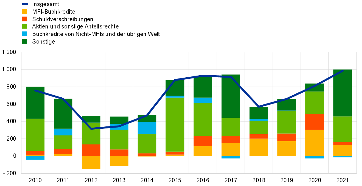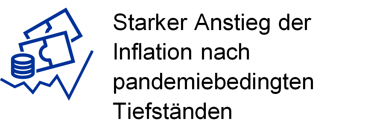 Mit dem raschen Hochfahren der Wirtschaft machten sich aber auch deutliche Spannungen bemerkbar. Während die Inflation im Euroraum zu Jahresbeginn noch auf einem sehr niedrigen Niveau gelegen hatte, ließen pandemiebedingte Lieferengpässe, die sich belebende weltweite Nachfrage und stark steigende Energiepreise die Inflationsrate in die Höhe schnellen. Die jährliche Gesamtinflation lag 2021 bei durchschnittlich 2,6 % nach nur 0,3 % im Vorjahr.