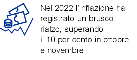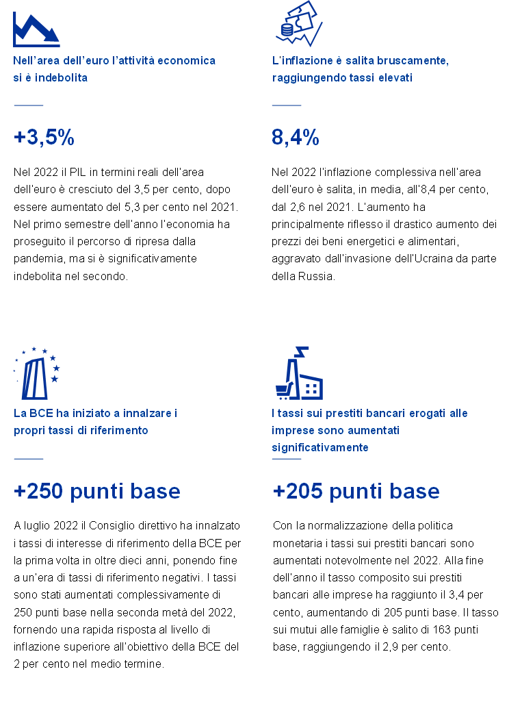 Nel 2022 l’inflazione nell’area dell’euro è salita all’8,4 per cento dal 2,6 del 2021. L’incremento ha principalmente riflesso un drastico aumento dei prezzi dei beni energetici e alimentari, innescato dalla guerra in Ucraina. Le passate strozzature dell’offerta e la ripresa della domanda repressa dalla pandemia di coronavirus (COVID‑19), insieme agli elevati costi degli input produttivi dovuti ai rincari dell’energia, hanno accresciuto le pressioni sui prezzi in molti settori dell’economia. Dopo essersi mostrata robusta nella prima metà dell’anno, quando in particolare il settore dei servizi ha beneficiato della revoca delle restrizioni connesse all’emergenza sanitaria, la crescita nell’area dell’euro ha segnato un rallentamento, principalmente a causa degli effetti del conflitto in Ucraina.