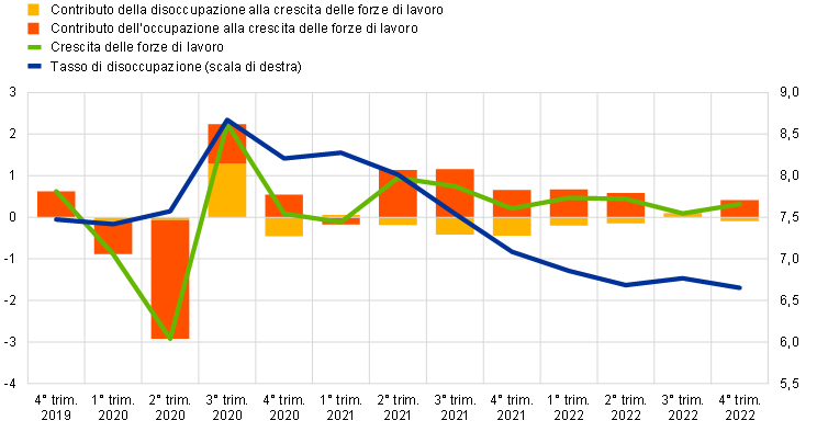 Nel 2022 il mercato del lavoro dell’area dell’euro ha mostrato, nel complesso, una buona capacità di tenuta nonostante la guerra mossa dalla Russia contro l’Ucraina, come indicato anche dai livelli persistentemente elevati di posti di lavoro vacanti verso la fine dell’anno. Tuttavia gli andamenti del mercato del lavoro e gli indicatori della domanda di lavoro ricavati dalle indagini sono rimasti contenuti nella seconda metà dell’anno. Il riquadro 1 confronta le dinamiche del mercato del lavoro negli Stati Uniti e nell’area dell’euro al fine di comprendere meglio le differenze e le analogie tra le determinanti della ripresa dalla pandemia e gli andamenti prospettici di occupazione e salari.