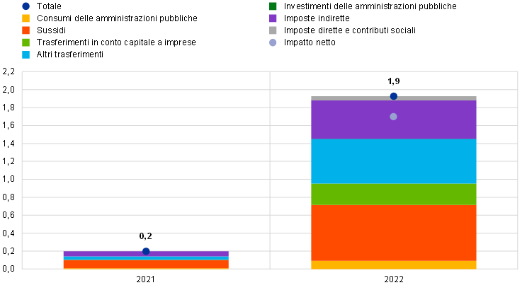Note: i valori positivi indicano il sostegno di bilancio. Gli istogrammi e i totali indicano il sostegno di bilancio lordo. L’impatto netto mostra la differenza tra il sostegno lordo e le misure discrezionali di finanziamento per le finalità indicate, secondo quanto individuato dagli esperti dell’Eurosistema.