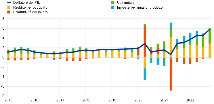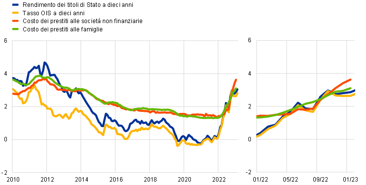 Il 2022 ha segnato un punto di svolta per la politica monetaria della BCE. Le prospettive di inflazione sono mutate bruscamente per effetto di due tipologie di shock che hanno colpito l’economia contemporaneamente. Innanzitutto, l’area dell’euro ha subìto una serie senza precedenti di shock negativi dal lato dell’offerta, causati dalle interruzioni nelle catene di approvvigionamento indotte dalla pandemia, dall’ingiustificabile invasione dell’Ucraina da parte della Russia e dalla conseguente crisi energetica, che hanno significativamente accresciuto i costi degli input in tutti i settori dell’economia. In secondo luogo, si è verificato uno shock positivo della domanda a seguito della riapertura delle attività economiche dopo la pandemia, che ha consentito alle imprese di trasmettere gli aumenti dei costi ai prezzi molto più rapidamente e intensamente che in passato.