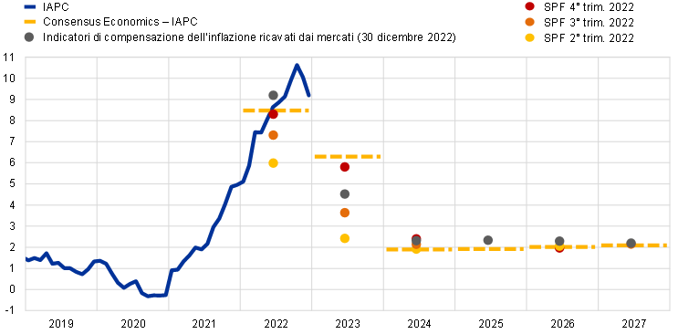 Fonti: Proiezioni macroeconomiche per l’area dell’euro formulate dagli esperti dell’Eurosistema, dicembre 2022 ed elaborazioni della BCE.