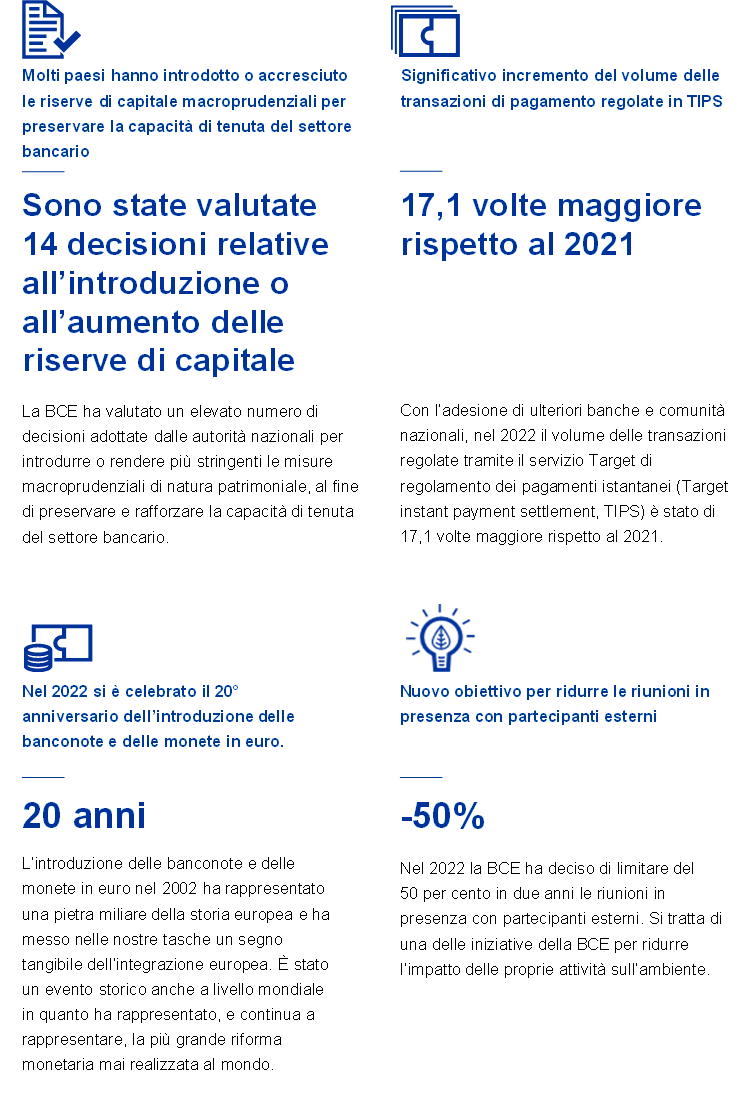 Nel 2022 abbiamo anche celebrato il 20º anniversario dell’introduzione delle banconote e delle monete in euro, pietra miliare della nostra storia e simbolo tangibile dell’integrazione europea. Ad oggi il contante resta il mezzo di pagamento più utilizzato dai cittadini europei, con quasi il 60 per cento dei pagamenti, e senza dubbio continuerà a svolgere un ruolo importante nella vita delle persone. Tuttavia, con la crescente digitalizzazione dell’economia, dobbiamo assicurare che i cittadini europei abbiano accesso anche a metodi di pagamento digitali sicuri, efficienti e pratici. Per questo motivo l’Eurosistema sta valutando la possibilità di emettere un euro digitale. Nel 2022, nell’ambito della fase istruttoria ancora in corso, l’Eurosistema ha stabilito i principali impieghi dell’euro digitale e ha individuato diverse decisioni fondamentali da assumere riguardo alle caratteristiche che deve avere.