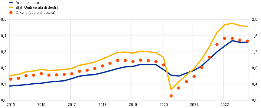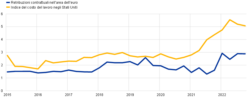 Cfr. il riquadro 1 “Un confronto tra l’andamento del mercato del lavoro nell’area dell’euro e negli Stati Uniti e il relativo impatto sulle retribuzioni” nell’articolo 2 Andamenti salariali e relative determinanti dall’inizio della pandemia nel numero 8/2022 del Bollettino economico della BCE.