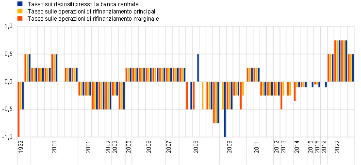 Tuttavia, con l’evolvere delle prospettive di inflazione è apparso chiaro che conseguire un orientamento di politica monetaria sostanzialmente neutrale non sarebbe stato di per sé sufficiente. Si prevedeva che l’inflazione si sarebbe mantenuta troppo a lungo su valori eccessivamente al di sopra del nostro obiettivo del 2 per cento a medio termine e vi erano segnali che stesse diventando più persistente, con pressioni sui prezzi più generalizzate e un rafforzamento dell’inflazione di fondo. In tali circostanze abbiamo dovuto spostare i tassi di interesse in territorio restrittivo e frenare la domanda.