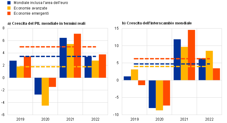 Note: gli aggregati del pannello a) sono calcolati utilizzando pesi per il PIL basati sulla parità del potere di acquisto. Gli istogrammi mostrano i dati. Le linee tratteggiate indicano le medie di lungo periodo (tra il 1999 e il 2022). Le ultime osservazioni si riferiscono al 2022 e sono aggiornate al 18 aprile 2023. Nel pannello b): la crescita dell’interscambio mondiale è definita come la crescita delle importazioni mondiali compresa l’area dell’euro. Gli istogrammi mostrano i dati. Le linee tratteggiate indicano le medie di lungo periodo (tra il 1999 e il 2022). Le ultime osservazioni si riferiscono al 2022 e sono aggiornate al 18 aprile 2023.