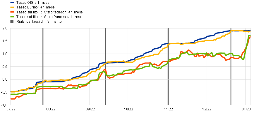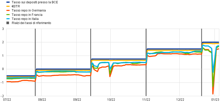 Nel mese di dicembre, dopo l’ultima riunione di politica monetaria dell’anno, abbiamo quindi annunciato che i tassi di interesse avrebbero continuato ad aumentare in misura significativa a un ritmo costante, per raggiungere livelli abbastanza restrittivi da assicurare un tempestivo ritorno dell’inflazione al nostro obiettivo. Al tempo stesso abbiamo dichiarato che, sebbene i tassi di interesse di riferimento della BCE costituissero il nostro principale strumento per definire l’orientamento di politica monetaria, avremmo anche iniziato a ridurre il portafoglio dei titoli del PAA a partire da marzo 2023, a un ritmo misurato e prevedibile. Questo annuncio era stato preceduto dalla decisione di ottobre di ricalibrare i termini e le condizioni applicati alla terza serie delle nostre operazioni mirate di rifinanziamento a più lungo termine, eliminando un deterrente al rimborso volontario anticipato dei fondi in essere. Tra la fine di giugno (quando sono terminati gli acquisti netti di attività) e la fine di dicembre le attività detenute per finalità di politica monetaria hanno registrato una diminuzione di circa 830 miliardi di euro, contribuendo alla normalizzazione del nostro bilancio.