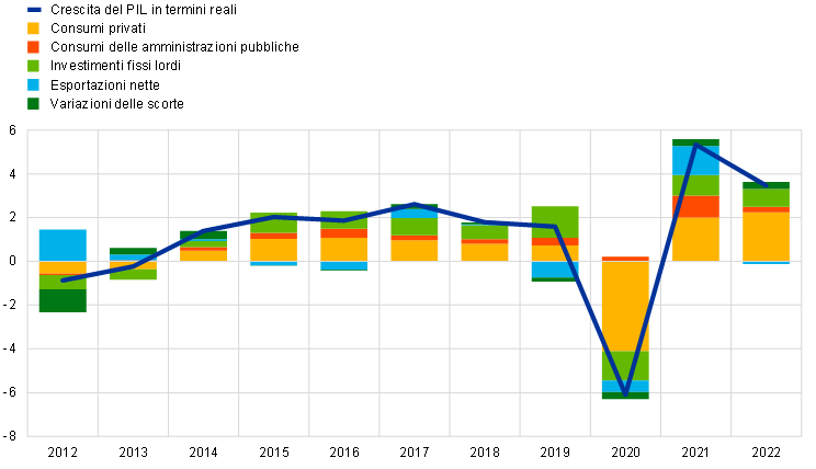 Nel 2022 il PIL in termini reali dell’area dell’euro è cresciuto del 3,5 per cento, dopo essere salito del 5,3 per cento nel 2021 con la ripresa dell’economia dalla recessione connessa alla pandemia (cfr. il grafico 1.3). L’espansione nel 2022 ha principalmente riflesso il robusto contributo proveniente dalla domanda interna. Alla fine dell’anno il prodotto nell’area dell’euro si collocava su un livello superiore del 2,4 per cento rispetto a quello antecedente la pandemia, ossia all’ultimo trimestre del 2019. La crescita, tuttavia, è stata molto eterogenea nei vari paesi, riflettendo le diverse strutture economiche e la misura in cui i singoli paesi hanno beneficiato della riapertura delle attività nel settore dei servizi e risentito dell’invasione russa dell’Ucraina. Con la perdita di slancio nella prima metà dell’anno della forte ripresa della domanda di servizi a elevata intensità di contatti, il drastico rincaro dei beni energetici ha iniziato a frenare la spesa e la produzione in tutta l’economia. L’area dell’euro ha inoltre risentito dell’impatto dell’indebolimento della domanda mondiale e dell’inasprimento della politica monetaria in molte delle principali economie, in un contesto caratterizzato da un’elevata incertezza economica e da un peggioramento del clima di fiducia presso le imprese e le famiglie.
