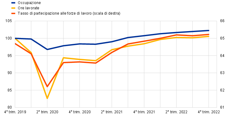 È proseguita la marcata ripresa del mercato del lavoro dalla pandemia, contestualmente al recupero dell’attività economica nell’area dell’euro. Nel quarto trimestre del 2022 l’occupazione totale e il totale delle ore lavorate hanno superato i corrispondenti livelli registrati nel quarto trimestre del 2019, rispettivamente, del 2,3 e dello 0,6 per cento (cfr. il grafico 1.6). Nel medesimo trimestre il tasso di partecipazione alle forze di lavoro nella fascia di età compresa tra i 15 e i 74 anni è salito al 65,2 per cento, collocandosi su un livello superiore di 0,5 punti percentuali a quello del quarto trimestre del 2019. In linea con la crescita dell’occupazione, il tasso di disoccupazione è ulteriormente diminuito, passando dal livello, già storicamente basso, del 6,9 per cento di gennaio 2022 al 6,7 per cento alla fine dell’anno (cfr. il grafico 1.7). Il ricorso alle misure di integrazione salariale, che durante la crisi aveva limitato i licenziamenti, è diminuito e i lavoratori che ne avevano beneficiato sono per lo più tornati al normale orario di lavoro.