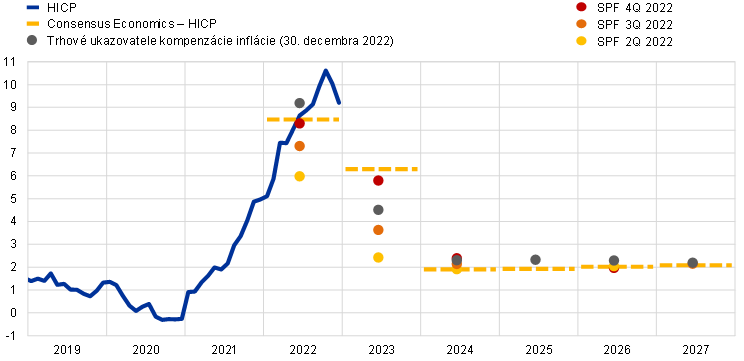 Zdroj: Makroekonomické projekcie odborníkov Eurosystému pre eurozónu, december 2022, a výpočty ECB.