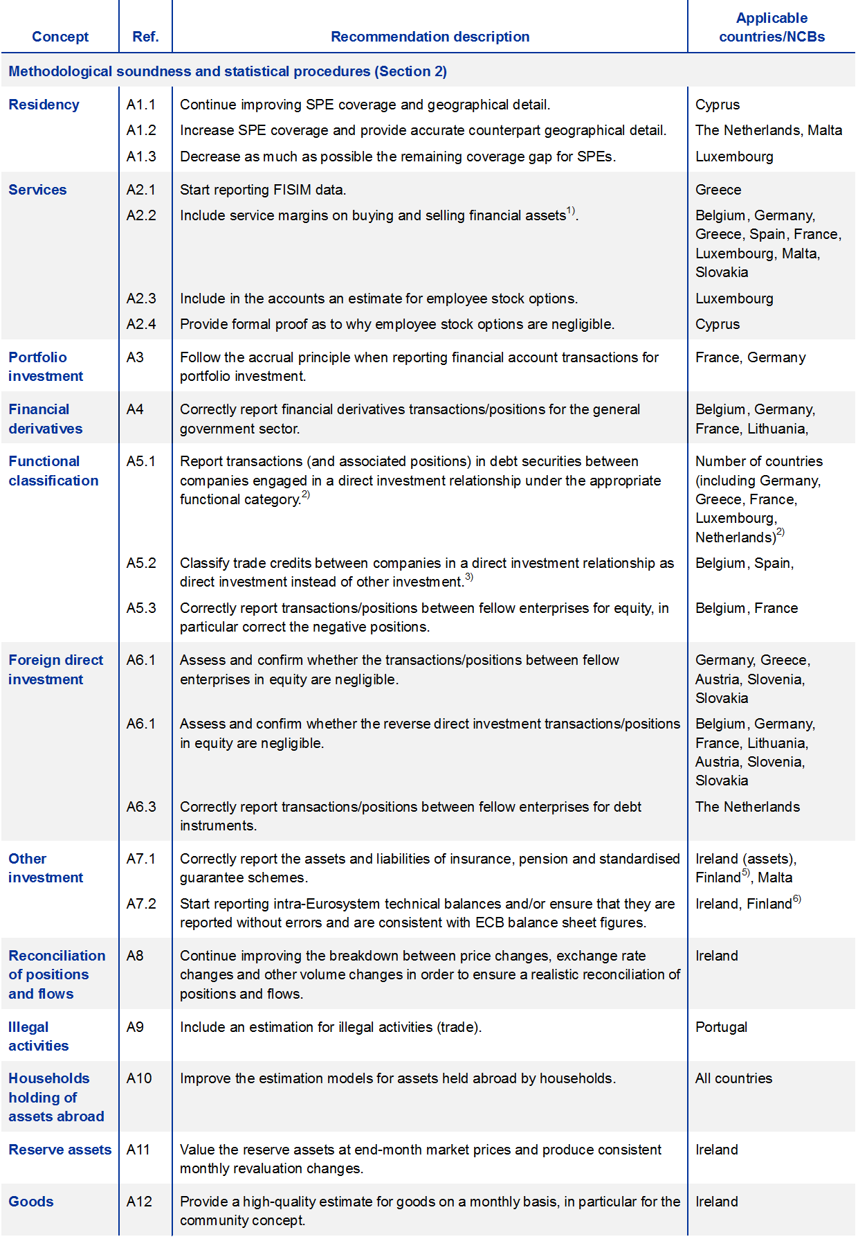 While statistical standards are generally observed, there is still room for improvement in terms of methodological soundness. Luxembourg, the Netherlands, Malta and Cyprus are encouraged to continue working to increase the coverage and quality of data for special purpose entities (SPEs). Greece should start reporting data for financial intermediation services indirectly measured (FISIM). Belgium, Germany, France and Lithuania should improve their reporting of financial derivatives positions/transactions for general government. Regarding foreign direct investment, some countries should make an extra effort to correctly report transactions (and associated positions) in debt securities and trade credits between companies engaged in foreign direct investment relationships in the appropriate functional category. The Netherlands should correctly identify transactions and positions between fellow enterprises, particularly as regards debt instruments[4]. Furthermore, national compilers in general should make efforts to improve the coverage of assets held abroad by resident households.