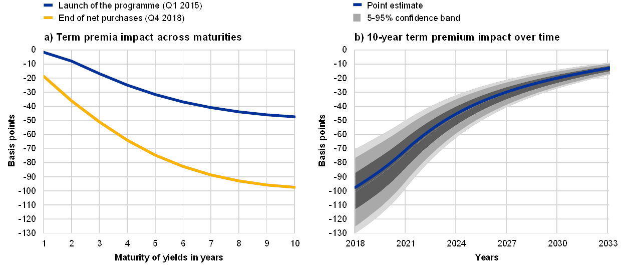 The compression in sovereign yields due to the APP-induced reduction in current and expected bond free float is estimated to stand at around 100 basis points for the ten-year maturity (Chart A, left panel). The chart illustrates the impact of the APP on term premia across the term structure at the time when the PSPP was announced and at the end of net asset purchases in December 2018. The term premium impact is larger for longer maturities.