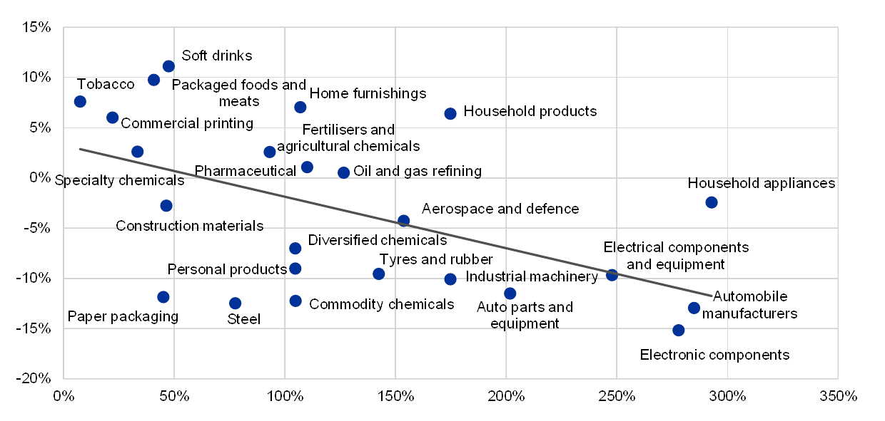 Notes: The chart shows the cumulated shares reaction following six major US and China tariff announcements since the beginning of 2018. Sub-industries classified according to the eight-digit Global Industry Classification Standard (GICS) of the S&P 500 sectoral indexes were matched to imports/exports and value added data according to the three-digit and four-digit North American Industry Classification System (NAICS). Sectoral trade openness is calculated as the sum of imports and exports divided by gross value added in the respective sub-industry in 2016. The latest observation is for 5 October 2018. The GICS sub-industries shown in the chart constitute 35% of the market capitalisation of the five underlying sectors in the S&P 500 for which trade and value added data were available (Materials, Industrials, Consumer Discretionary, Consumer Staples and Information Technology) and 20% of the total market capitalisation of the S&P 500. The NAICS classifications used constitute 58% of the total US trade in goods in 2016.