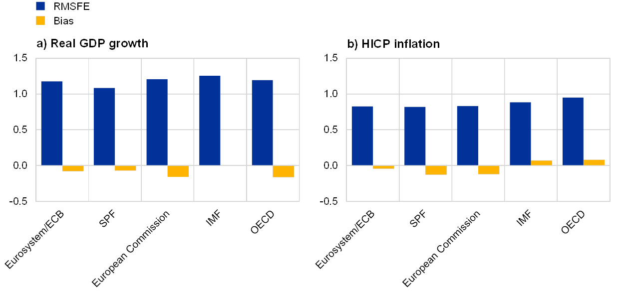 Notes: The charts refer to the period 2010-18. Errors are defined as the outturn available one year after the initial publication minus the projection. Eurosystem/ECB staff macroeconomic projections refer to the average RMSFE and bias from the March and June projections for the next calendar year. For the other forecasters, the statistics refer to forecasts published in the second quarter for the next calendar year.