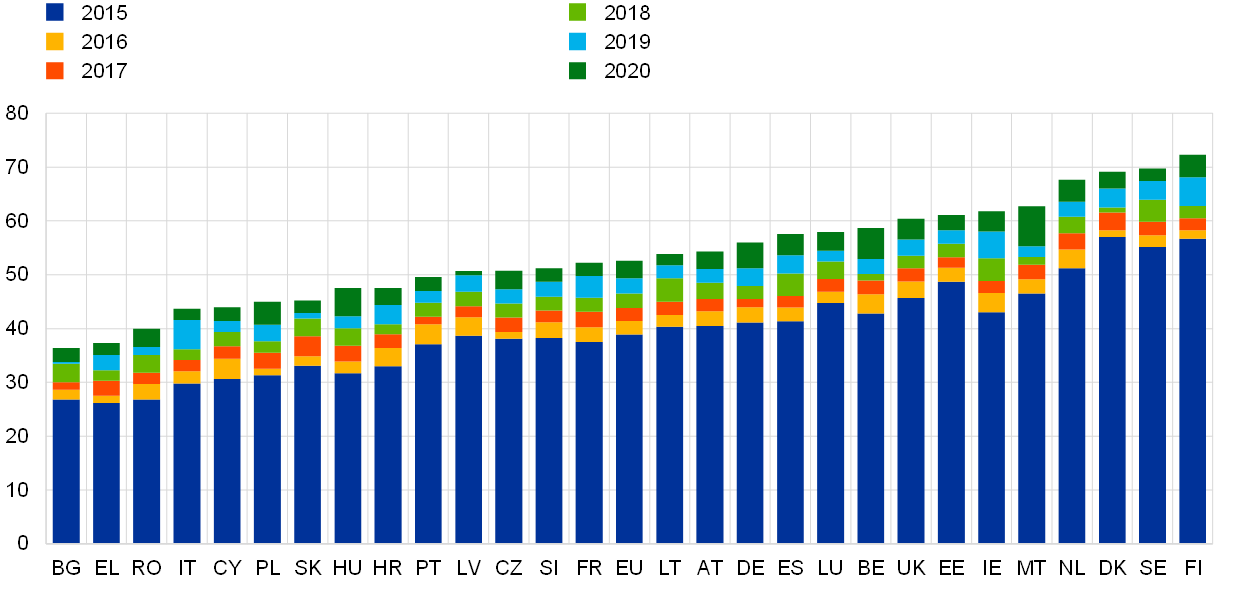 Measuring the reach of the digital economy is not straightforward, but a metric for gauging the degree of digitalisation across EU countries is the extent to which employment is related to digital activities. Two EU countries – Estonia and Sweden – consistently top the digital employment charts. A relatively wide definition of ICT-dependent employment can include all those working in ICT-intensive occupations, whether or not they are employed directly in ICT sectors, as well as those employed in broader ICT task-intensive occupations. Such a measure demonstrates the high degree of cross-country heterogeneity, with the share of total ICT-dependent employment ranging from around 22% in Luxembourg (surpassing even that of the United States) to around 7% in Greece, Italy and Slovakia. While barely reaching 11% in the euro area and the EU, this broader definition of ICT-dependent employment amounts to roughly 17% of total employment in Sweden and Estonia, similar to the share seen in the United States.[55]