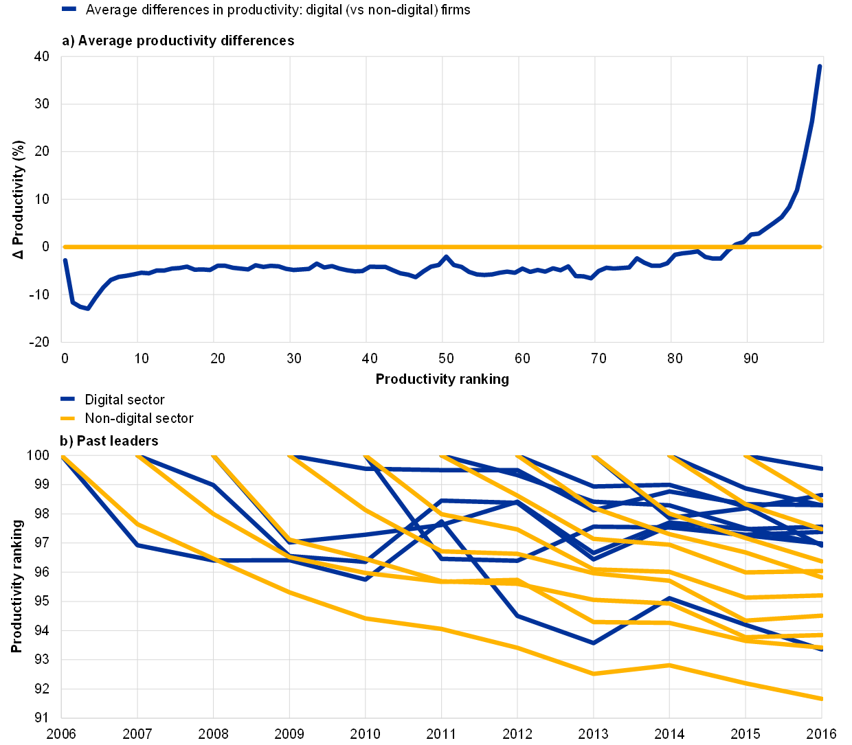There are substantial differences between digital and non-digital companies in their productivity distribution and leadership persistence. Using firm-level data for the “big four” euro area countries, the top panel in Chart 3 shows the relative productivity of digital, compared with non-digital, firms across the distribution.[17] For the most part, digital firms are less productive than their non-digital peers, but for firms at the top decile of their respective distributions, digital firms are substantially more productive. They are also younger and larger across the distribution. Moreover, productivity leadership persistence is higher for the digital sector. The bottom panel in Chart 3 shows the average ranking of the top 1% productive firms in their sector in any given year as time passes; while on average leaders remain highly productive, persistence in leadership is substantially higher for digital firms. At the same time, the rise of new leaders seems broadly similar across sectors.