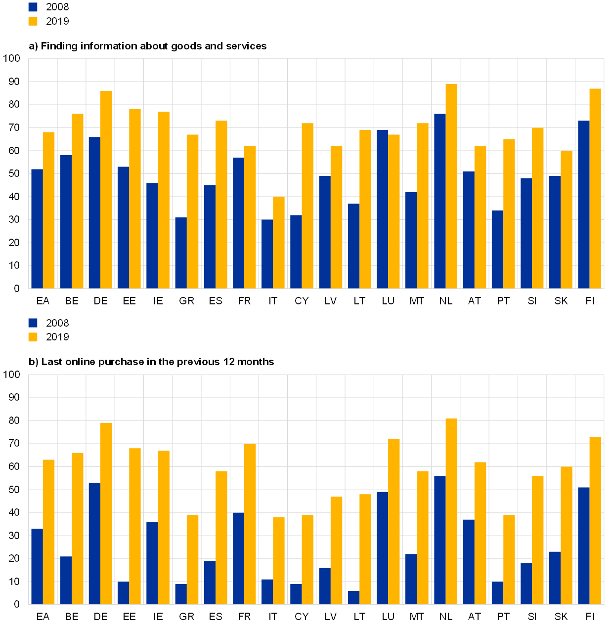 The extent to which the indirect effects described above have an impact on inflation partly depends on the prevalence of e-commerce in the euro area. Moreover, the opportunity to compare prices online may already be a competition-enhancing factor. Online sales to consumers comprised almost 14% of total retail sales (excluding cars and motorcycles) in the euro area in 2017 – a share that has almost doubled over the last ten years. The most frequently purchased items were clothing, accommodation and travel.[66] Consumers have also significantly increased their use of e-commerce. In 2019 the share of people using the internet to obtain information about goods and services reached 70%, with 60% using it to buy them – a significant increase over the last ten years (see Chart 6). Among euro area countries, Germany and the Netherlands take the lead, followed by Luxembourg and France, with southern economies (Greece, Italy, Cyprus and Portugal) somewhat lagging behind for actual purchases.