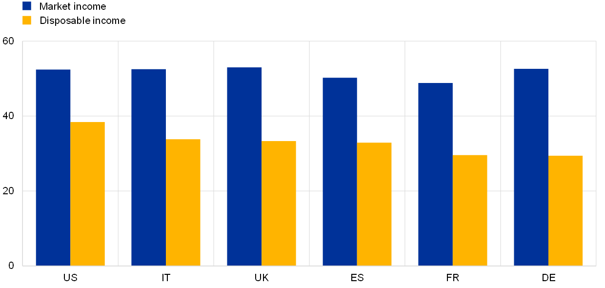 Income taxation and government transfers have a dampening effect on income inequality, with the precise nature of that impact varying across countries on the basis of their tax systems. If we compare the distribution of disposable income with that of market income for the four largest euro area countries, the United Kingdom and the United States (Chart 2), the dampening effect of direct taxation (e.g. via progressive income taxes) and transfers is evident. The degree of income inequality is indicated by the Gini coefficient, which measures the extent to which the distribution of income among individuals/households deviates from a perfectly equal distribution, with a value of 0 indicating absolute equality and a value of 100 signalling full inequality (whereby the top income group receives all income). Most notably, we can see that the amount of income redistribution carried out by the government is far higher in the European countries (average decline of 20 basis points in the Gini coefficient) than it is in the United States (decline of 14 basis points). However, it is not clear, a priori, to what extent the higher degree of redistribution in Europe can explain the more limited increase in income inequality in the European countries in question (as shown in Chart 1). Two recent studies concluded that the difference between Europe and the United States in terms of the increase in income inequality is driven mainly by market income – i.e. income before redistribution.[5]