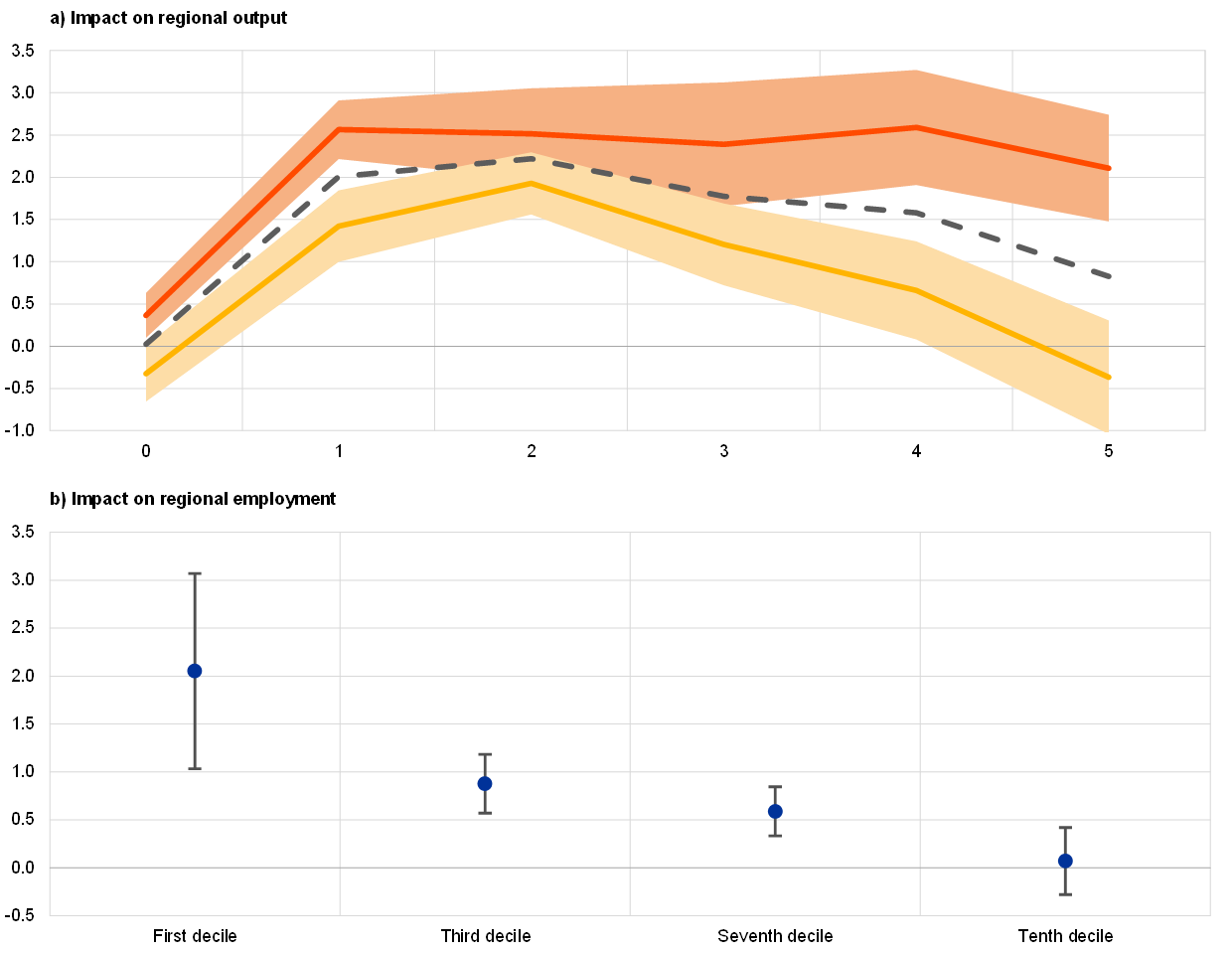 Notes on panel b: This panel shows the impact that a 100 basis point interest rate cut has on employment five years later (in percentages) across various deciles of the distribution of regional per capita GDP. Dots indicate point estimates; bars denote 90% confidence intervals. Regions are defined in accordance with Eurostat’s NUTS 3 classification.