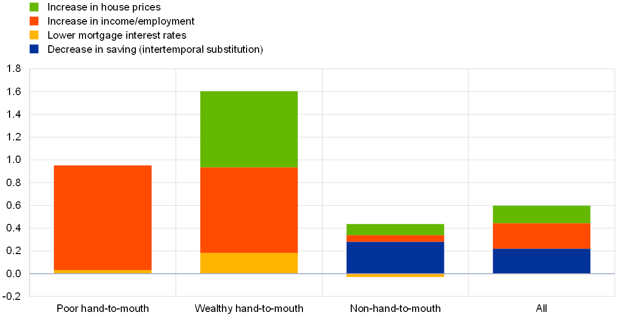 Notes: This chart shows the impact that a 100 basis point cut in real interest rates has on consumption one year later, breaking that impact down into (i) the standard intertemporal substitution effect (which reduces saving), (ii) the cash flow channel resulting from the decline in mortgage interest rates, (iii) the income channel resulting from increases in employment and wages, and (iv) the housing wealth effect caused by increases in house prices. The size of those effects varies depending on households’ wealth. In the euro area, 10% of households are poor hand-to-mouth, 12% are wealthy hand-to-mouth and 78% are non-hand-to-mouth. For the purposes of this chart, the euro area has been modelled by aggregating data for Germany, Spain, France and Italy.