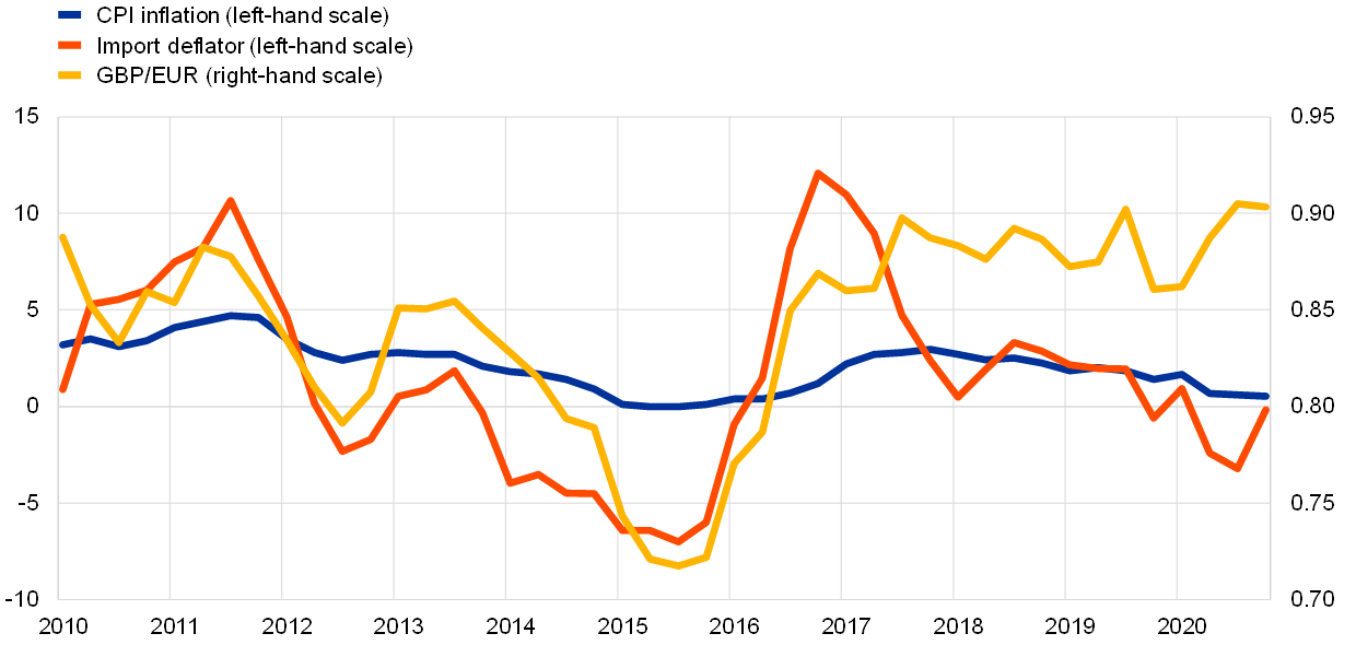 This article reviews the development of UK import demand and balance of payments since the referendum in order to assess the likely implications for euro area foreign demand.[2] It focuses on early insights into factors which have affected UK imports in the period between the referendum and the start of the coronavirus (COVID-19) pandemic. The departure of the United Kingdom from the EU could potentially result in some disruption to euro area export growth in the coming years if, for instance, UK import demand is reduced or diverted as a consequence of Brexit.