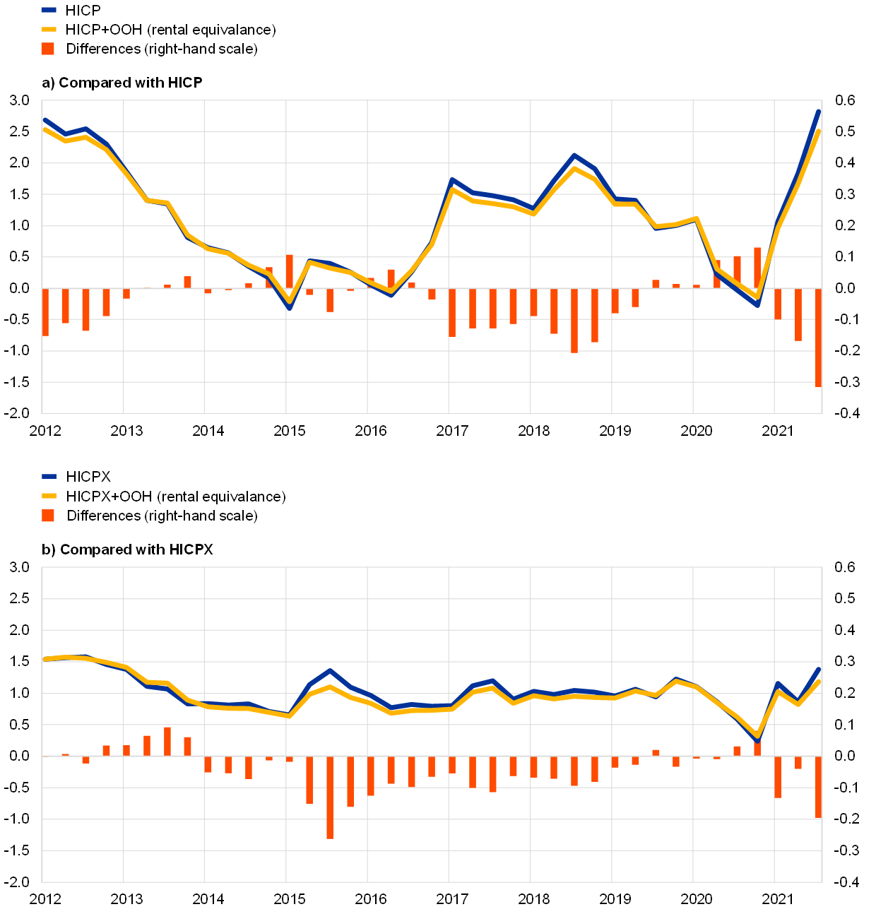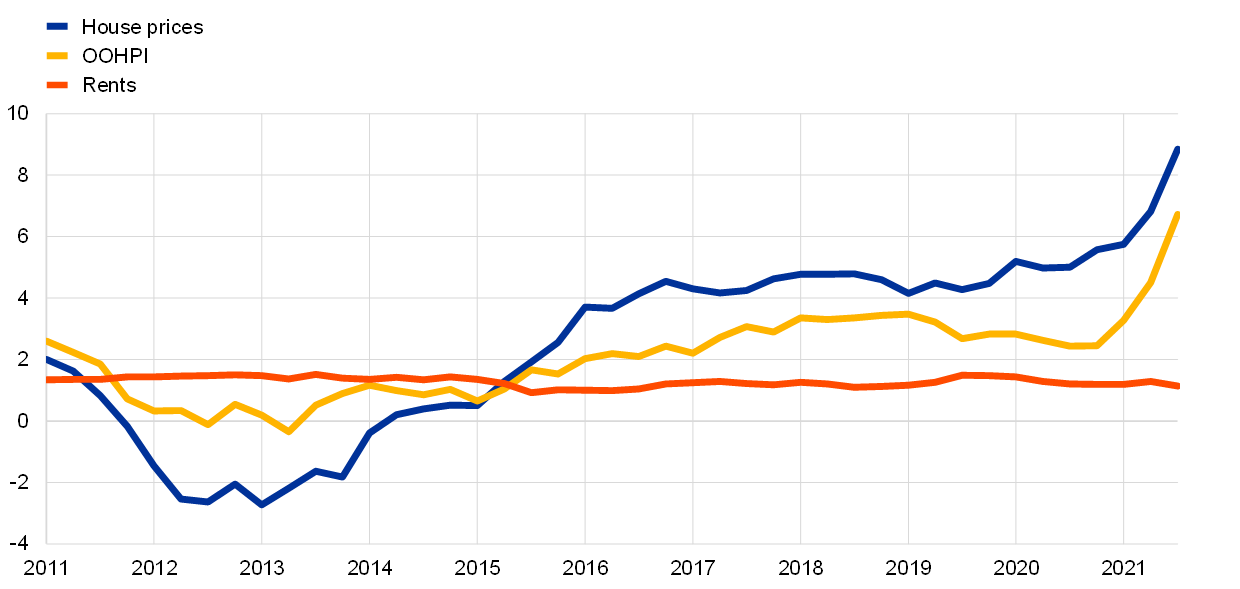 The Governing Council has always been in favour of including OOH in the HICP, but under certain conditions. A broad coverage of household expenditure in the headline inflation measure better represents the inflation rate that is relevant for households. However, the integration of price changes for OOH into the HICP requires OOHPIs to be brought into line with HICP standards. The Governing Council has argued that the full integration of OOH price changes into HICPs might adversely affect their reporting frequency and timeliness: OOH price indices are currently published once a quarter with a delay of around 100 days, whereas the full set of HICP data is published at monthly frequency with a delay of around two weeks.[12] Moreover, in principle, the HICP should capture changes in prices of consumer goods and services rather than changes in asset prices. However, an owner-occupied residential property is not only a consumption good, but also an asset that both serves as a store of wealth and provides a flow of consumable housing services. OOHPIs include such an asset component. Hence, the partial inclusion of asset price developments via OOHPIs in the HICP might be problematic.
