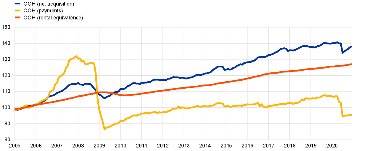 In the monetary policy strategy review, the Governing Council discussed the treatment of OOH-related costs under the rental equivalence approach and the net acquisition approach.[13] The review focused on the statistical features of these OOH treatments in the HICP and their potential implications for monetary policy, including communication aspects. The user cost approach and the payments approach were not considered suitable, mainly owing to their inclusion of interest payments, which would establish a direct link to the ECB’s policy rates.