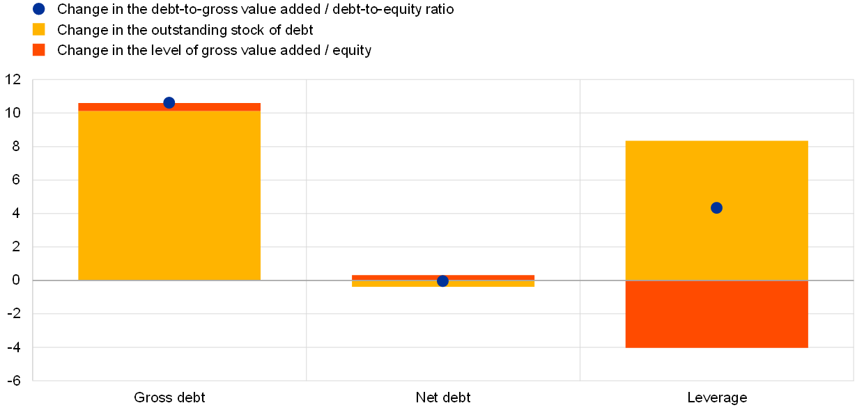 Notes: Consolidated gross debt is defined as the sum of total loans granted to NFCs, debt securities issued and pension liabilities minus intra-sectoral lending. Consolidated net debt is defined as consolidated gross debt net of currency and deposit holdings. The debt-to-equity ratio is at book value, which is proxied by notional stocks. In panel b, in the first column the blue dot represents the change in the gross debt-to-gross value added ratio, in the second column it represents the change in the net-debt-to-gross value added ratio, and in the third column it represents the change in the debt-to-equity ratio. The latest observations are for the third quarter of 2021.