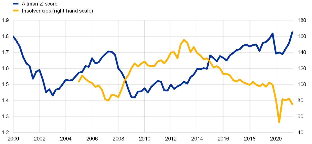 On aggregate, the balance sheets of firms suggest limited insolvency risks. The Altman Z-score[12] provides one indicator for assessing corporate balance sheet health and insolvency risk. While this indicator was designed to assess the insolvency risk of an individual firm, it can also be computed for the NFC sector as whole, as the availability of timely data is better at the aggregate level than for individual non-listed companies. At the country level, the index shows a negative relationship with insolvencies (Chart 9, panel a). Following a sharp deterioration in 2020 due to the pandemic, the Z-score partially rebounded in 2021, reflecting improved corporate balance sheets.