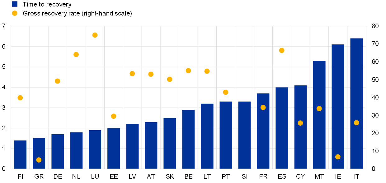 Notes: Panel b: data were collected for the period between 2015 and 2018 and refer to formal insolvency procedures launched by creditors with respect to SME lending and do not consider non‐judicial settlements. Cross-country comparability may be limited by differences in bank practices. The gross recovery rate is defined as the percentage of the bank claim before deducting the cost of recovering the claim. Data on recovery rates are not available for Slovenia.