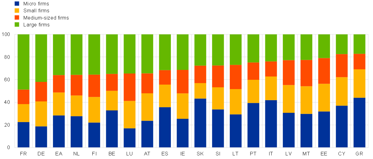 SMEs are the dominant form of business organisation in the euro area (Chart A, panel a). They represent a heterogeneous segment, ranging from single, unincorporated entrepreneurs to medium-sized companies listed on a stock exchange. They account for about 62% of total employment and 50% of value added in the euro area. In all euro area countries, SMEs typically deliver less value added per number of employees than large firms. At the euro area level, the productivity gap relative to large firms amounted to 44%, 34% and 16% for micro, small and medium-sized firms respectively in 2019 (Chart A, panel b). In Ireland, Greece and Portugal in particular, SMEs are less productive than larger firms, while the productivity differences are less pronounced in the Netherlands, Luxembourg, Estonia and Malta, for instance. This notwithstanding, according to the Organisation for Economic Co-operation and Development (OECD), smaller firms often outperform larger enterprises on account of competitive advantages in responding to niche demand and greater flexibility to customise and differentiate products. Start-ups and young firms, which are generally small or micro firms, are also the primary source of job creation in many countries.[21]