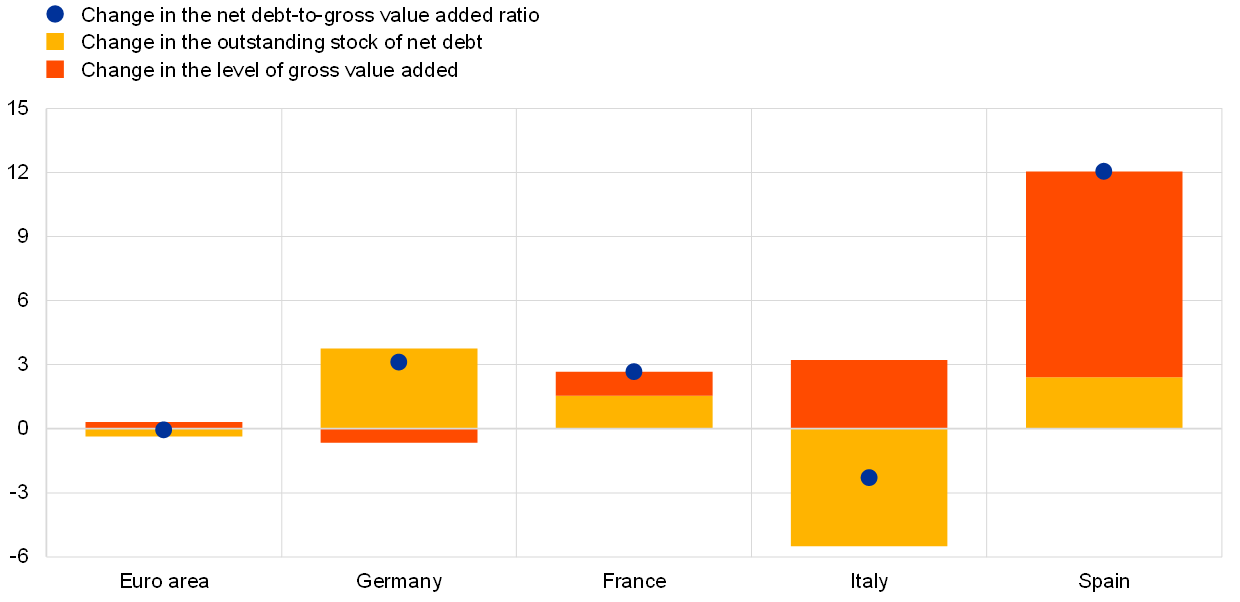 There are also significant differences in corporate indebtedness across countries. The NFC gross debt-to-value added ratio amounted to close to 200% in France in the third quarter of 2021, compared with around 120% in Germany (Chart 4, panel a). In France, the gross debt ratio has increased continuously since the end of 2007, as firms have financed their capital expenditure and mergers and acquisitions mostly with debt instruments. In Germany, indebtedness remains significantly lower than in other large euro area economies, as firms had financed their expansion mainly with internal funds before the pandemic. At the same time, the increase in the debt ratio since the end of 2019 was most significant in Spain, where, like in Italy, a large part of the decline observed between 2012 and 2019 was reversed (Chart 4, panel b). The decline in the level of net debt was particularly large in Italy, while in Germany, France and Spain net debt has increased (Chart 4, panel c). Differences between countries in the size of debt increases during the pandemic can largely be explained by (i) differences in the severity of the COVID-19 crisis and the resultant length and extent of lockdowns, (ii) differences in the take-up of state-guaranteed bank loans, and (iii) differences in economic and financial structures.