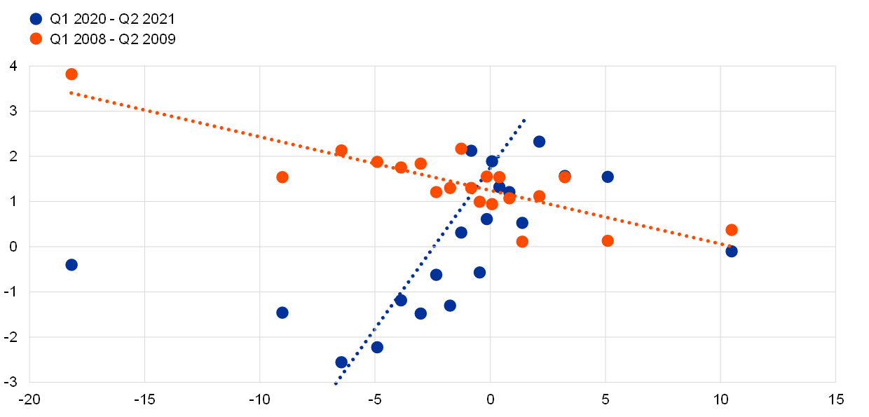 The different motives driving the financing decisions of firms during the two crises are also reflected in firm-level data. Both crises exerted heterogeneous effects on the performance of individual firms, as measured, for instance, by sales growth (Chart 4). While the bulk of firms suffered a contraction, some weathered the crises better or even improved their performance.[8] As a result, a distinction can be made between hard-hit firms whose borrowing decisions were dictated by the need to satisfy emergency liquidity needs, and less-affected firms whose borrowing decisions remained predicated on the relative attractiveness of different debt instruments. This distinction subsequently manifested itself in opposing relationships between firm performance and debt financing structures during the two crises (Chart 4). During the GFC, even hard-hit firms increased their relative reliance on bond finance to sustain their emergency needs for credit against the backdrop of tight loan supply constraints (orange line in Chart 4). During the pandemic, however, hard-hit firms were able to rely on bank lending as a safety net, whereas less-affected firms could draw on bond finance to benefit from its favourable relative cost (blue line in Chart 4).