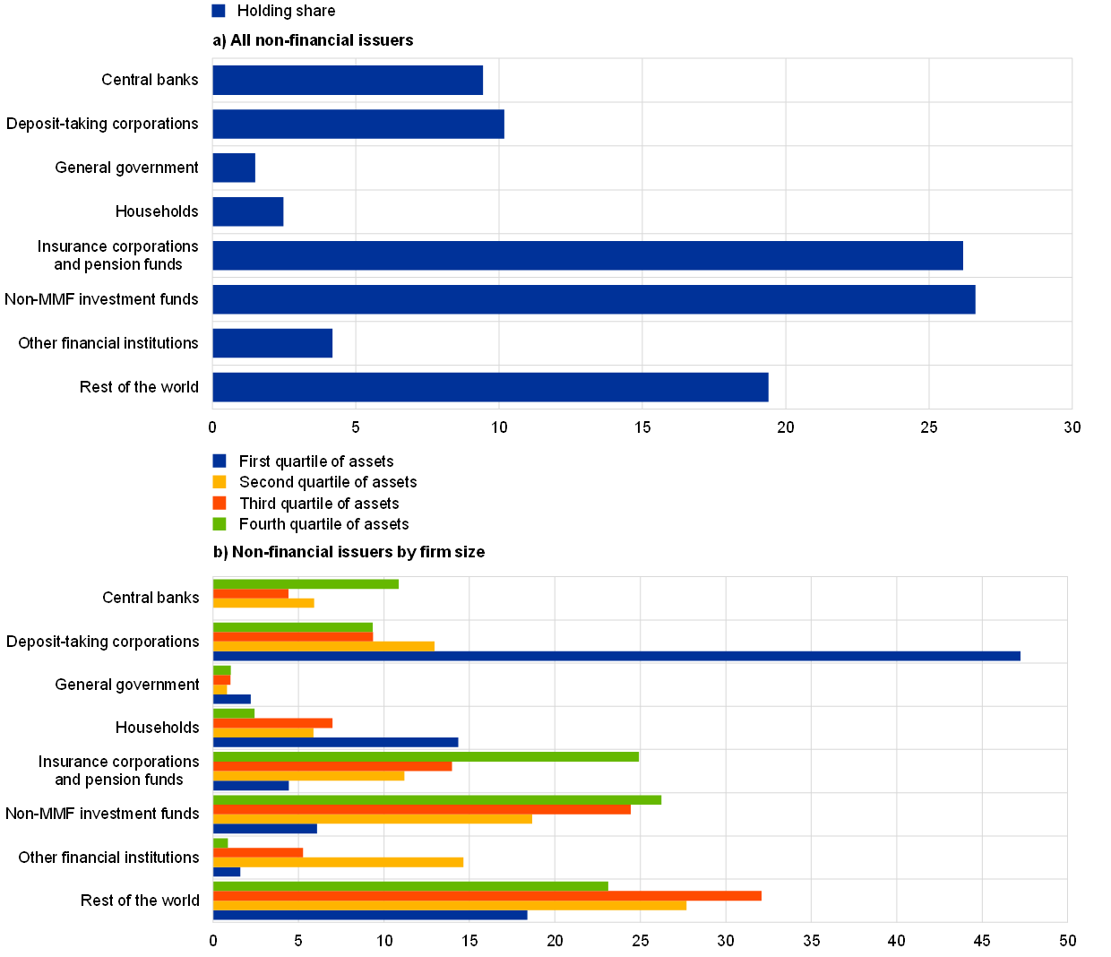 Notes: Chart B presents the investor composition of the debt securities issued by euro area non-financial corporations at the end of 2019. The rest of the world is estimated as the difference between the total outstanding amount of debt securities and the amounts held by selected investors in the euro area. Holdings by non-financial corporations are not included. Panel a) presents the investor composition for all non-financial issuers, and in panel b) the sample is divided using the firm’s assets as an approximation for its size. In panel b) the firms’ assets grow with each quartile (i.e. the first quartile includes firms with the lowest level of total assets in the sample, while the firms in the fourth quartile have the highest level of total assets). MMF refers to money market funds.