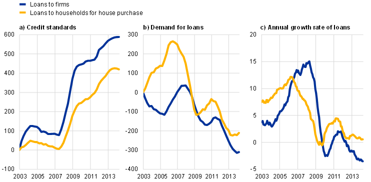 Bank lending conditions, demand for loans and bank lending to firms and households for house purchase, 2003-2014