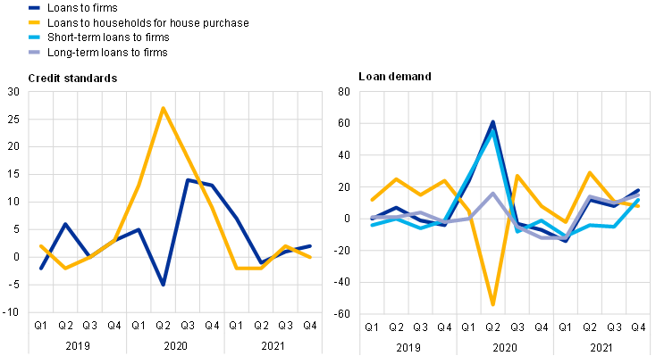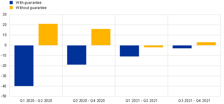 Notes: Panel b): Banks’ replies are based on a BLS ad hoc question on changes in banks’ credit standards and demand for loans with pandemic-related government guarantees and for loans without government guarantees. This ad hoc question was included in the survey from the January 2021 BLS, providing information on the first and second half of 2020, until the January 2022 BLS, providing information on the second half of 2021. The latest observations are for the fourth quarter of 2021.