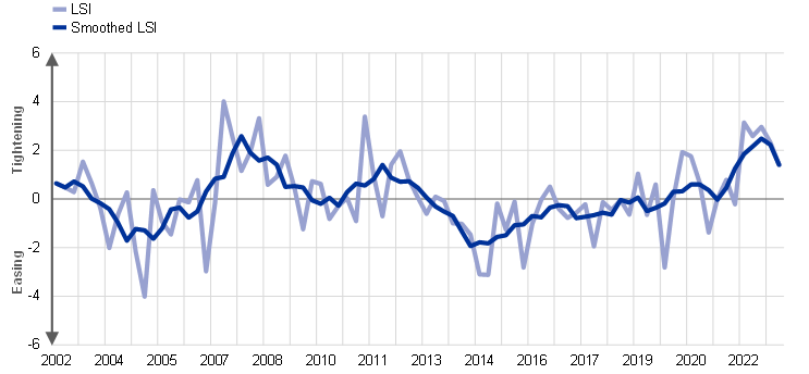 Notes: Loan supply indicator (LSI) for bank lending to firms, as in Altavilla, Darracq Paries and Nicoletti (2019). The smoothed series is a five quarter-centred moving average. Positive values indicate a tightening, while negative values indicate an easing. The latest observations are for the second quarter of 2023.