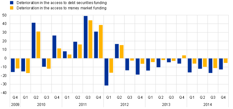 Notes: Panel a): Access to funding based on the BLS ad hoc question “As a result of the situation in the financial markets, has your market access been hampered when tapping your usual sources of wholesale funding?”, which was included in the BLS from the third quarter of 2007 until the third quarter of 2009. Panel b): From the fourth quarter of 2009 onwards, access to funding based on the revised current version of the question asking for the change (deterioration or improvement) in banks’ access to funding. “Money market funding” refers to unsecured interbank money market funding. The latest observations for panel b) are for the fourth quarter of 2014.