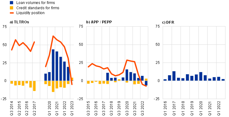 Notes: The time periods shown on the x-axes refer to the respective periods covered by the biannual questions – e.g. Q1 2023 for the period Q4 2022 - Q1 2023. Impact of the first and second series of targeted longer-term refinancing operations (TLTROs), from Q3 2014 to Q2 2017, based on a one-sided question asking only for the easing impact on credit standards. Impact of the third series of TLTROs from Q3 2019 to Q1 2023. Impact on credit standards and liquidity position not available for DFR. Impact on loan volumes not available for TLTRO II, and for APP/PEPP before Q1 2018. The latest observations are for the first quarter of 2023 for TLTROs, the APP and the pandemic emergency purchase programme (PEPP, introduced in March 2020), and for the third quarter of 2022 for the DFR.