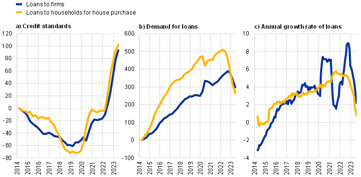 Rising interest rates in the context of tighter monetary policy have been a major factor driving the decrease in demand for loans to firms and housing loans. Loan demand has fallen strongly since 2022, especially for housing loans, for which the net decrease started in the second quarter of 2022, and somewhat later (due to the surge in demand in the context of the energy crisis), in the fourth quarter of 2022, for firms (Chart 7, panel b). This followed an extended period of net increases in loan demand since 2014, interrupted by the pandemic period. It reflects in part the broader role of the interest rate channel of monetary policy, as the tightening of monetary policy induces higher borrowing costs (including via an inward shift of the loan supply curve), thereby dampening economic growth and loan demand (which would manifest as a downward shift of the loan demand curve). The particularly stark response of demand for loans for house purchase strongly reflects the high elasticity of demand to higher borrowing costs. The downward pressure on loan demand from higher interest rates has been accompanied by deteriorating housing market prospects, signalling the interconnectedness of these factors and the recent decline in euro area house prices.