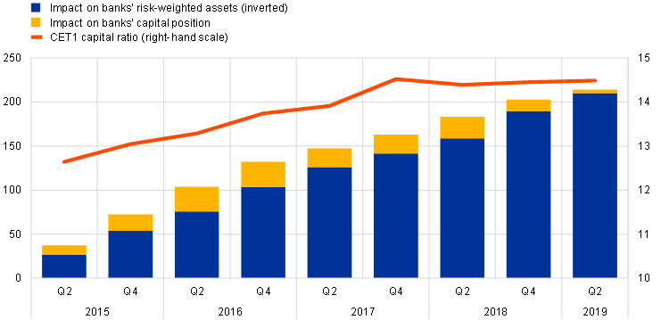 Supervisory actions and regulatory requirements induced banks to accumulate capital and adopt more prudent lending practices while not impeding the transmission of the monetary policy easing to lending conditions. Banks reported increased capital positions and a reduction in risk-weighted assets, in their quest to comply with supervisory requirements (Chart 8, panel a) in the context of the reform of Basel II requirements.[23] In the first years following the announcement of measures to reform Basel II requirements and to set up a Single Supervisory Mechanism in the European Union (2011-2013), bank replies in the BLS pointed to a tightening impact of supervisory requirements on their credit standards, reflecting their intensified efforts towards capital accumulation and balance sheet clean-up.[24] Consistent with the prudential nature of the requirements, the decrease in banks’ risk-weighted assets stemmed from a relative reduction in riskier loans. This is in line with the broadly neutral impact of supervisory requirements on credit standards over the period 2014-2019, after the tightening impact earlier on.[25] In other words, data from the BLS suggest that stricter supervisory and regulatory requirements did not impede the transmission of the monetary policy accommodation after 2014 in itself, but rather contributed to containing unwarranted levels of risk-taking by banks.[26]