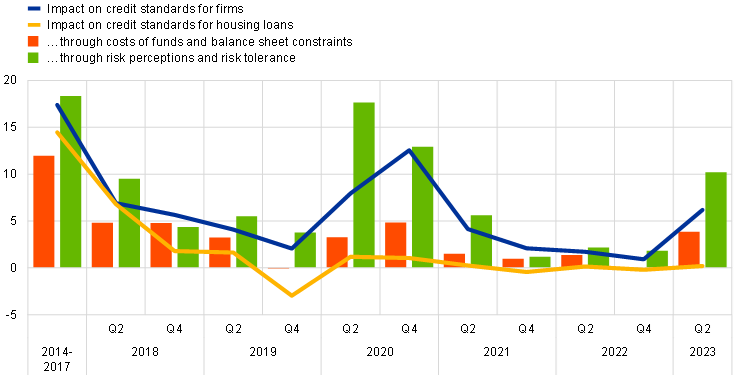 Notes: See the notes to Chart 2. “Banks’ risk tolerance” was introduced in the survey questionnaire in the first quarter of 2015. The latest observations are for the second quarter of 2023.