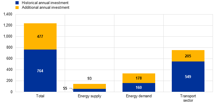 Zooming in on the sectoral estimates, investment needs vary significantly across sectors. According to the European Commission, in absolute terms most investment is needed in the transport sector, with a total of €754 billion per year required for its transition towards carbon neutrality (Chart 1, panel b). By far the largest share, amounting to around 80%, relates to investment in road transport, which includes passenger transport and the charging infrastructure for electric vehicles but also goods transport. In relative terms, by contrast, the largest increase in green investment will be needed in clean energy supply. Compared with historical averages, investment in this sector will need to increase by a factor of around 1.7 annually until 2030 to decarbonise energy supply.