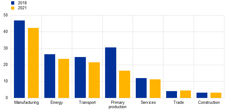 Banks are expected to play a crucial role in financing the green transition in the euro area. The green transition requires substantial amounts of funding, largely expected to be provided by the private sector. Given that loans from euro area banks account for nearly 60% of the stock of debt finance of euro area non-financial corporations and for more than 80% of the stock of debt of euro area households, banks make a key contribution to the financing of those activities that result in the release of carbon emissions.[8] Banks are therefore expected to play an important role in the financing of the green transition. The amount of carbon emitted by corporates in the euro area that can be linked to funding from euro area banks trended down overall from 2018 to 2021, but banks continued to be highly exposed to firms’ carbon emissions (Chart 2).[9] This exposure varies widely across industries, but is particularly large in the manufacturing, energy and transport sectors, which underscores the challenges these sectors still have ahead of them in the green transition.